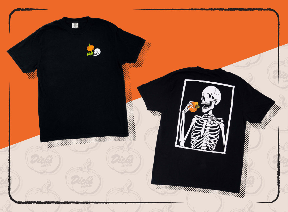 Get ready for Halloween with this (not so) spooky Smiling Skeleton T-Shirt. It pairs perfectly with carving pumpkins, jumping in the leaves, or (of course) enjoying a Deluxe. Get you super soft Dick's Drive-In Smiling Skeleton T-shirt while supplies last.