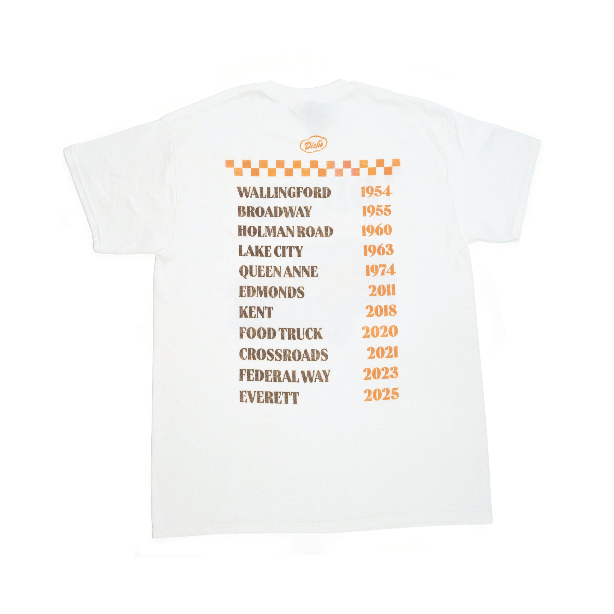 The front keeps it classic with a 1954 Chevrolet Bel Air and the Dick’s Drive-In name. The back does the storytelling: every location, every opening year, printed like a road map through time.