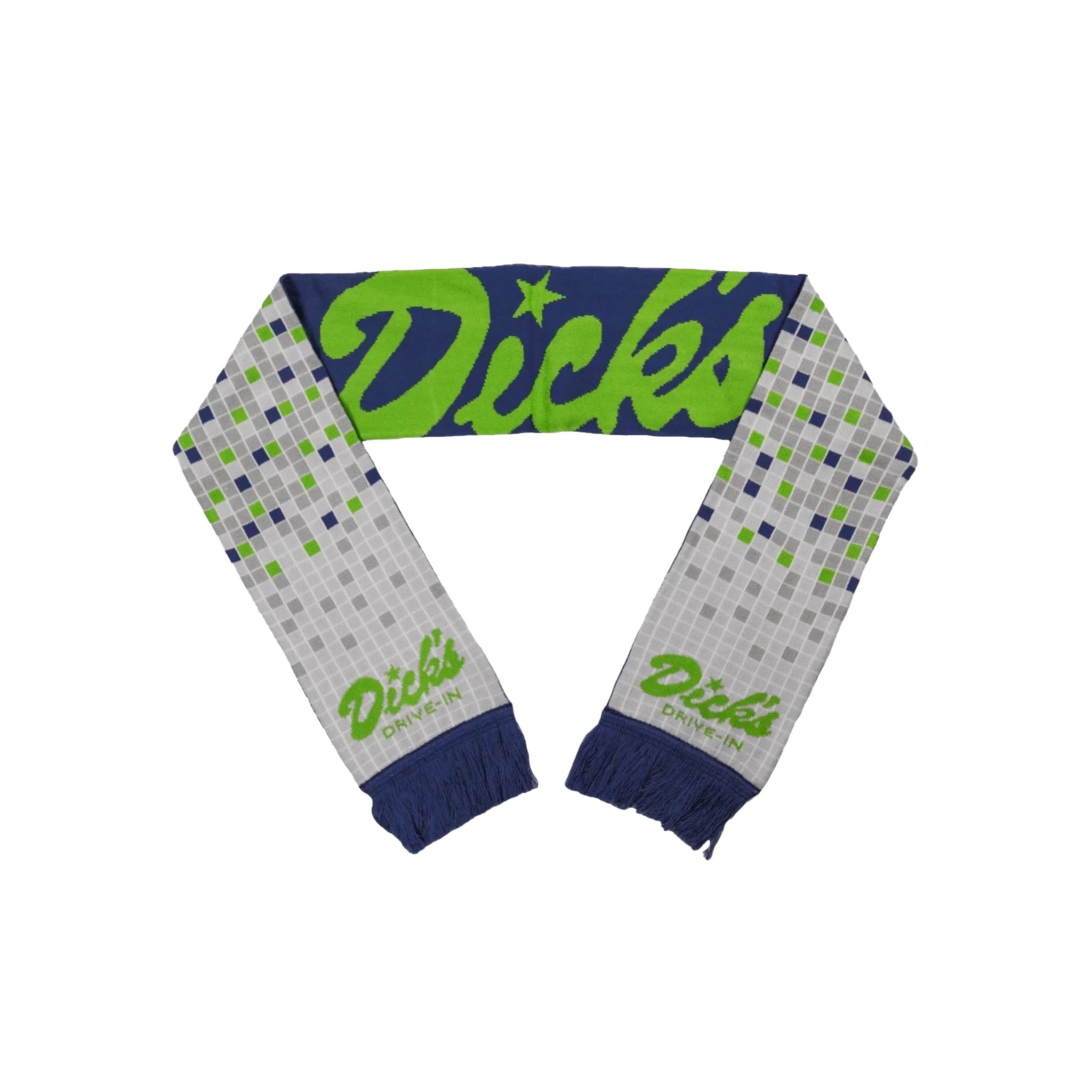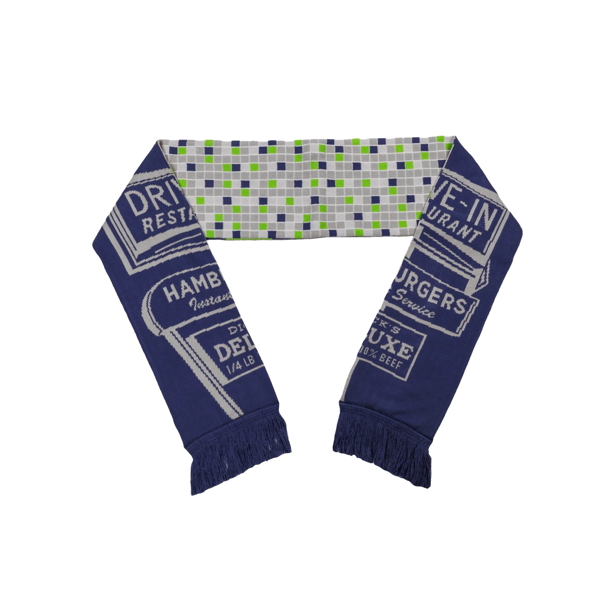 Show up in the cozy tradition of the Seattle Touchdown Tradition Scarf, a custom-knit accessory designed in winning colors—bold blue and vibrant green—and with the Drive-In's unmistakable tile design, all for fans who know exactly what they’re representing without spelling it out.