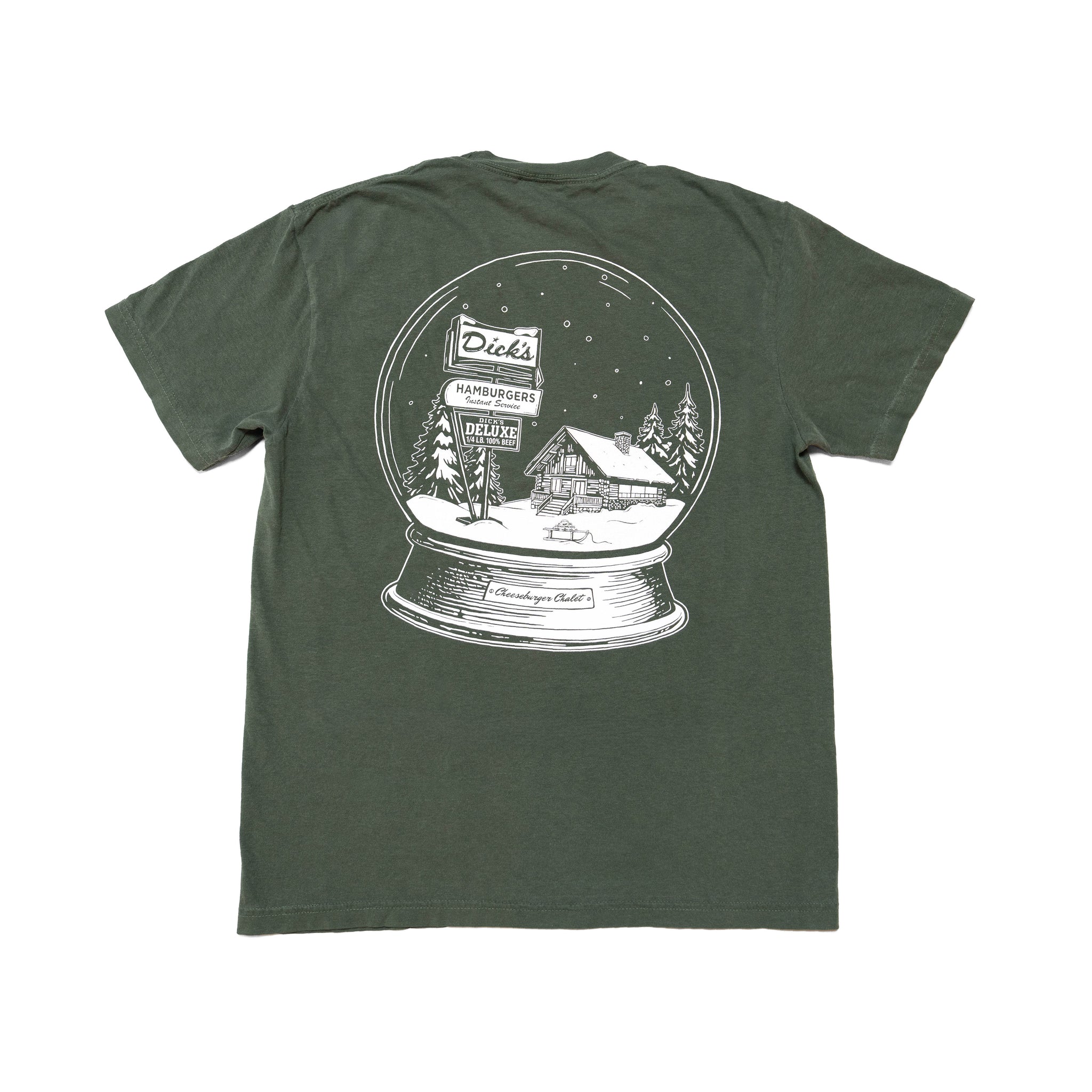 Step into the Cheeseburger Chalet with all the magic of a snowy Drive-In winter. This limited-edition Winter Snow Globe T-Shirt features a quaint cottage and the Dick's Drive-In pylon sign, complete with snow drifts and a classic sled delivering a cheeseburger spread.