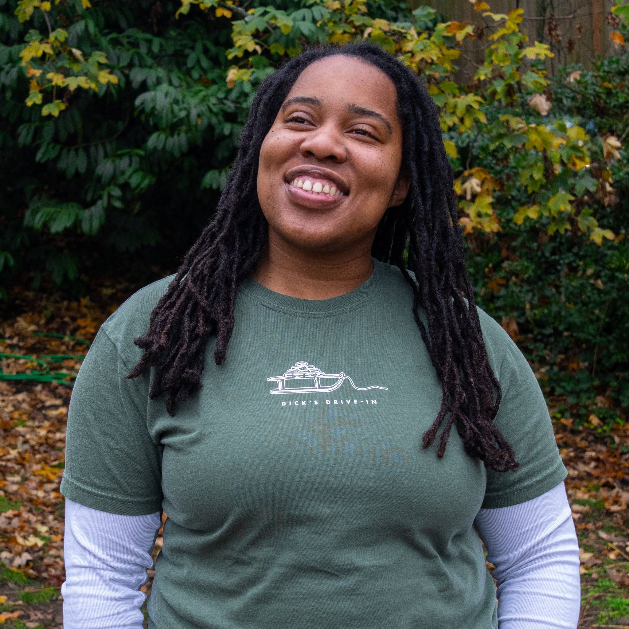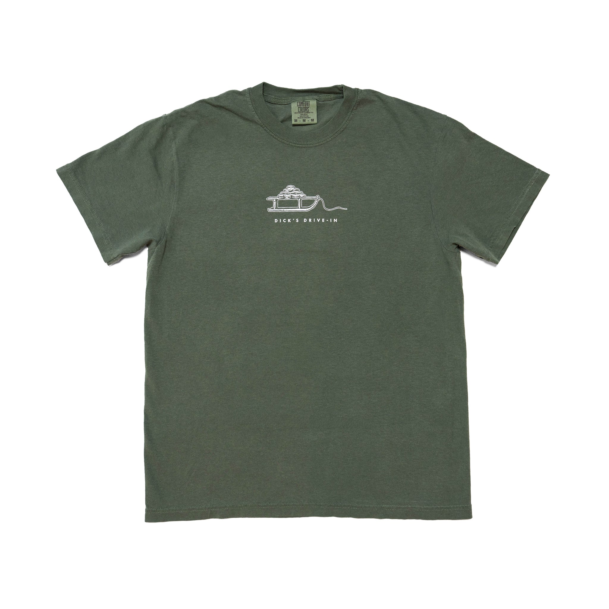 The design comes to life on the back of the shirt with a snowy, iridescent quality. The front showcases the beloved cheeseburger sled and the Dick's Drive-In name—tying the whole look together.